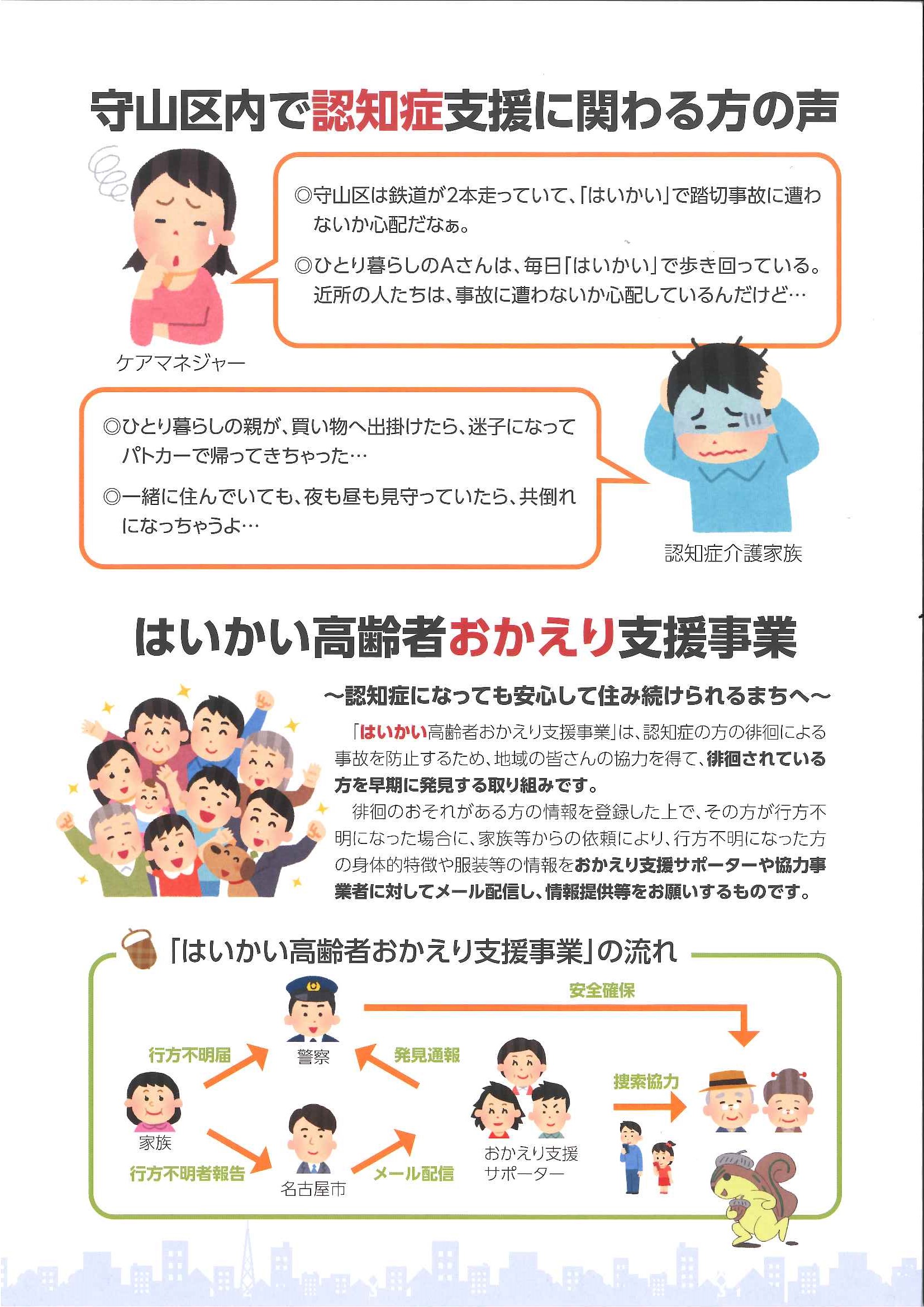 「はいかい高齢者おかえり支援事業」のPRパンフレットを作製しました!認知症のご高齢者や介護家族の方々がはいかいで困った場合でも、早期発見されるように本センター中心に企画し、守山区地域ケア推進会議メンバーで話し合って作りました。見守りの目をみんなで増やし、安心して暮らせる守山区にしていきたいです!