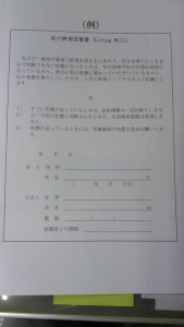 最後に、名古屋市医師会のスーパーバイザー黒木信之氏からは、メディカルエンディング(終末期)の医療・看護・介護の準備について、自宅で最期を迎えるために何を準備しますか?ということで地域包括システムの説明と、突然に備えて日頃からエンディングの治療の希望と選択を考えておくことの大切さということで、リビングウィル(生前の意思)として私の終焉宣誓書の例などのお話しがありました。