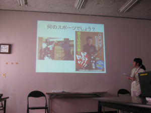今回は、いきいき支援センターより棒体操と脳トレを実施しました。棒体操では、新聞紙を丸めて棒を作ると、皆さん童心に帰ったように棒を振ったり、ポンポンと肩を叩いて楽しんでいました。また脳トレで早口言葉を実施すると、笑顔で大きな声を出していただけました。また来年度の認知症家族支援事業等についても、ご案内をさせていただきました。(写真は、本センター職員が参加した皆さんの前で体操などを説明しているところです)