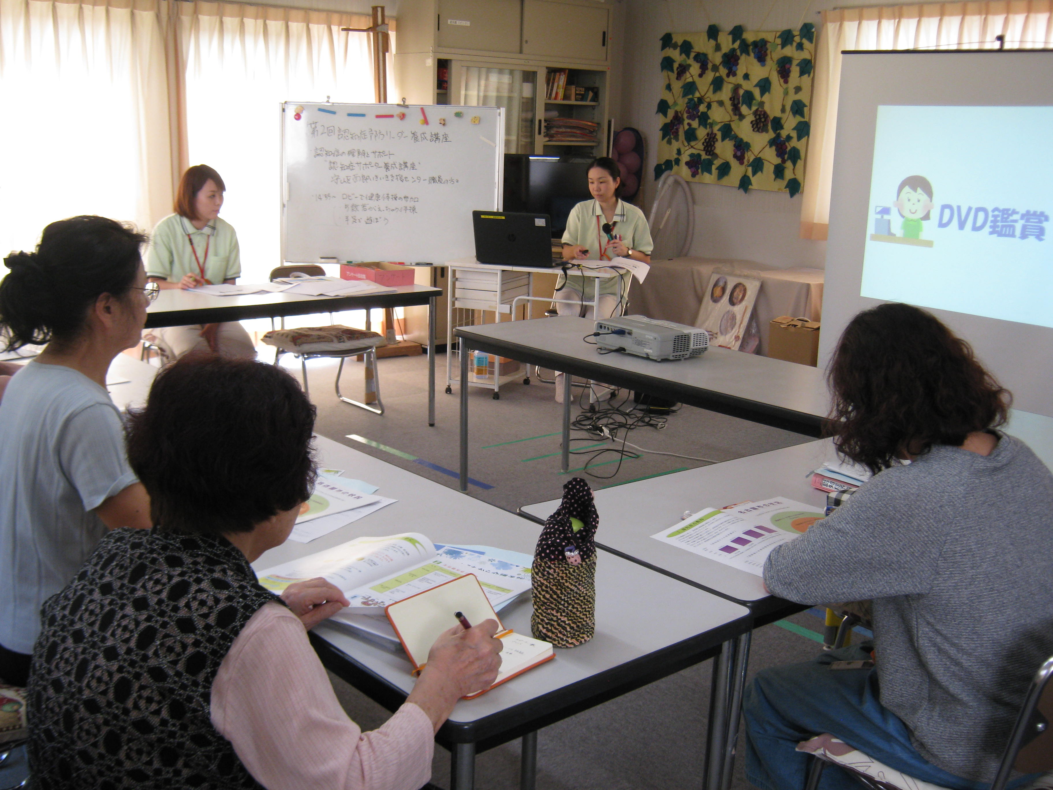 冊子・DVDを活用しながら認知症への理解を深めていただき、その後グループワークを行いました。グループワークでは実際の場面を想定し、認知症の方への接し方についての意見交換を行いました。皆様とても積極的に取り組んでみえました。