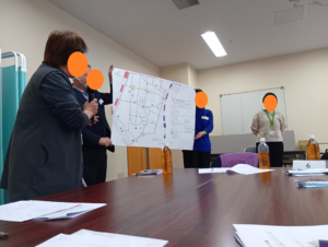 いきいき支援センター職員より鳥羽見学区の高齢者数や相談事例について情報提供の後、『鳥羽見のまちを見える化しよう』をテーマにグループごとに地域資源について情報共有を行った後、鳥羽見学区のキャッチフレーズを考えていただきました。