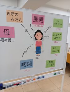 第3回家族教室では「いろいろな制度について知ろう」というテーマで認知症ケアパスや見守りや暮らしのサポート資源について、介護保険制度や判断力が低下した際に利用できる成年後見制度などについてセンター職員から説明させて頂きました。また後半では「わたしの介護地図」を作成して頂き、普段関わっている方への気持ちを表出したり、客観的に現在の自分をみつめる良い機会になったのではないかと思います。